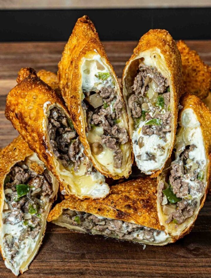 If you love a classic Philly cheesesteak sandwich, this version is going to be a favorite. It has all the flavors you expect, seasoned beef, sautéed onions and peppers, and melty cheese, but wrapped in a crispy shell. Even better, it is made with ground beef, which makes it easier to cook and perfect for feeding a crowd. These egg rolls are great for parties, game nights, or even meal prep. You get that savory, cheesy filling inside a golden, crunchy wrapper. Each bite is packed with flavor. Prep Time: 25 minutes Cook Time: 35 minutes Total Time: 1 hour Servings: 24 Yield: 24 egg rolls