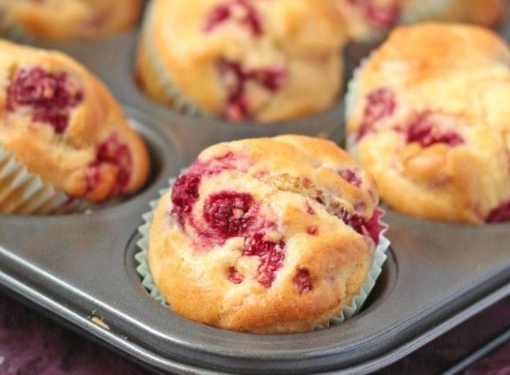 These muffins are also sugar-free! The only sweetener is banana, resulting in just 4 grams of sugar per muffin. They’re moist, slightly sweet, and have a burst of tartness from the lemon and raspberries.